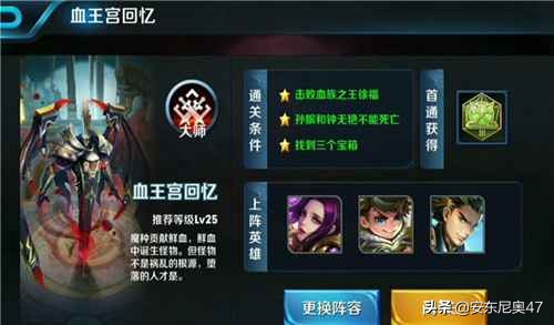 想要通关,首先要了解的就是通关的条件是什么?这里血王宫回忆三星的通关条件,首先是要打徐福,他可是被称为血族之王的。在玩游戏的过程中,还要保证两个英雄不能死亡,那就是孙膑和钟无艳不能死亡的条件,还有一点比较重要,在游戏结束前,需要你找到3个宝箱。通关条件是要牢记在心的,然后我们再来研究如何搭配英雄。