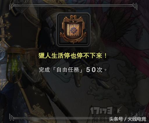 第一行最后一个:猎人生活停也停不下来,完成五十次自由任务。自由任务中有大量的解锁食材、奖励衣装。完成所有自由任务后解锁的新大陆的白风任务奖励【调查团票】,是制作匠之护石3的必需素材,因此建议尽快做完所有自由任务,顺便解锁此成就