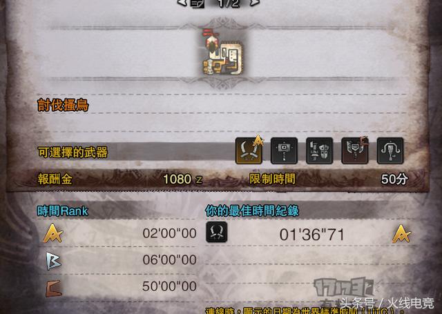 第二行第二个、第四个:完成【调查任务】五十次与完成【斗技大会】任务50次。前者仍不提,后者则是比较困难的任务。由于斗技大会中给予的装备普遍并不完美,怪物固定为多人血量且攻击欲望极其强烈,因此玩家初见往往需要十几分钟才能完成一次任务,耗时非常长,玩家也很容易感到疲惫。如果你没有基友陪刷,只能单刷,那么我建议使用【双刀】完成【斗技大会02】,既击杀骚鸟任务,此任务单人熟手只需一分半即可完成,新手也能四分钟内击杀骚鸟,可以说比起其他斗技大会任务,速度非常之快。