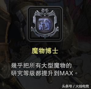 第四行第一个:魔物博士,将所有可以研究的怪物(包括丝瓜在内)的研究等级都提升到最高级,上下位均有的怪物为6级,只有上位的怪物为4级。有些不满的就在对应地图摸脚印和痕迹即可。比较例外的是熔岩龙,一般打得很少痕迹也不多,这个就只能多刷了。