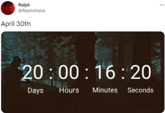 Ralph在推特上发出了一张还有“20天”的倒计时图片,并后续配文写到:“首次公布仍然定在5月”。