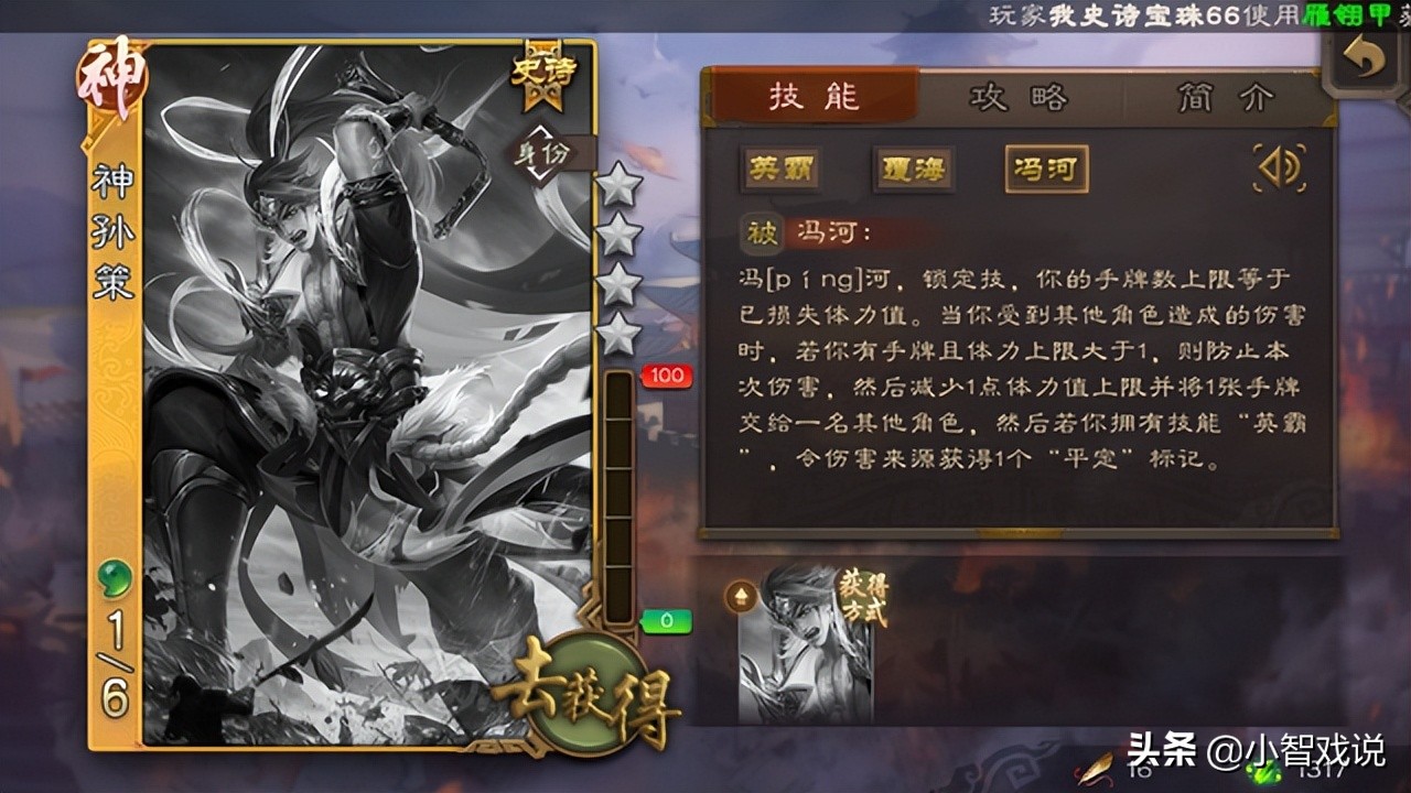 毕竟没用用过这个角色,大概分析一下技能。一技能英霸有些离谱,毕竟大部分武将回合外的手牌上限都要靠体力数量维持,也就是单打情况下,一个三血武将两回合后基本就废了。回合外只能留下一张牌够干啥的?而神孙策开局就是6上限1血,怎么和他比?