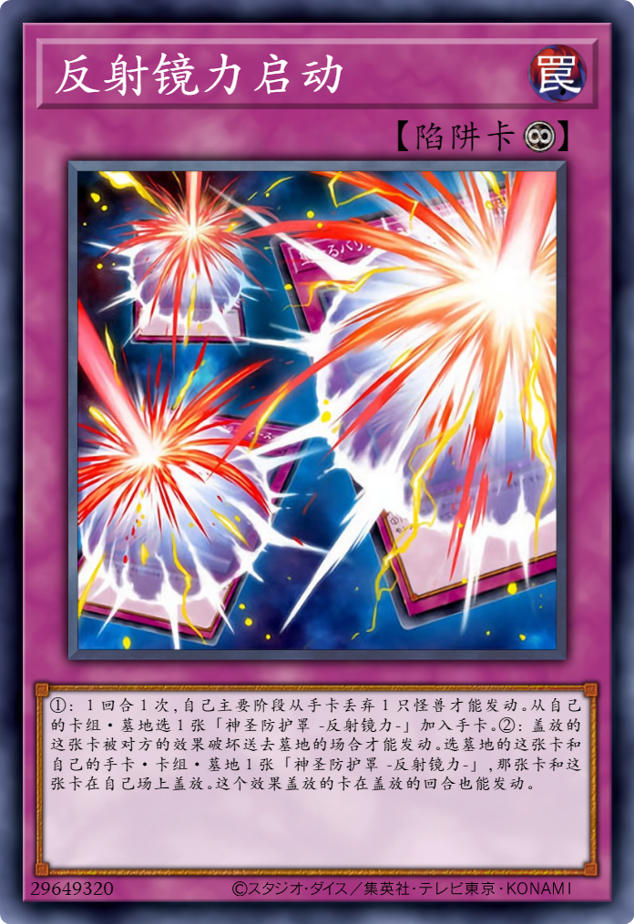 2005年3月,应该是出于玩家“破坏游戏氛围”的抗议,K社将【神圣防护罩-反射镜力-】从小黑屋放出来,恢复成为了限制卡身份。因为当时【雷击】和【黑洞】都被关进了小黑屋,环境内缺乏可以“破坏对方场上全部怪兽”这一类型的魔法·陷阱卡。牌佬们有需求,K社也没有设计下位替代卡的打算,所以将其从小黑屋里放了出来了,复归为限制卡。