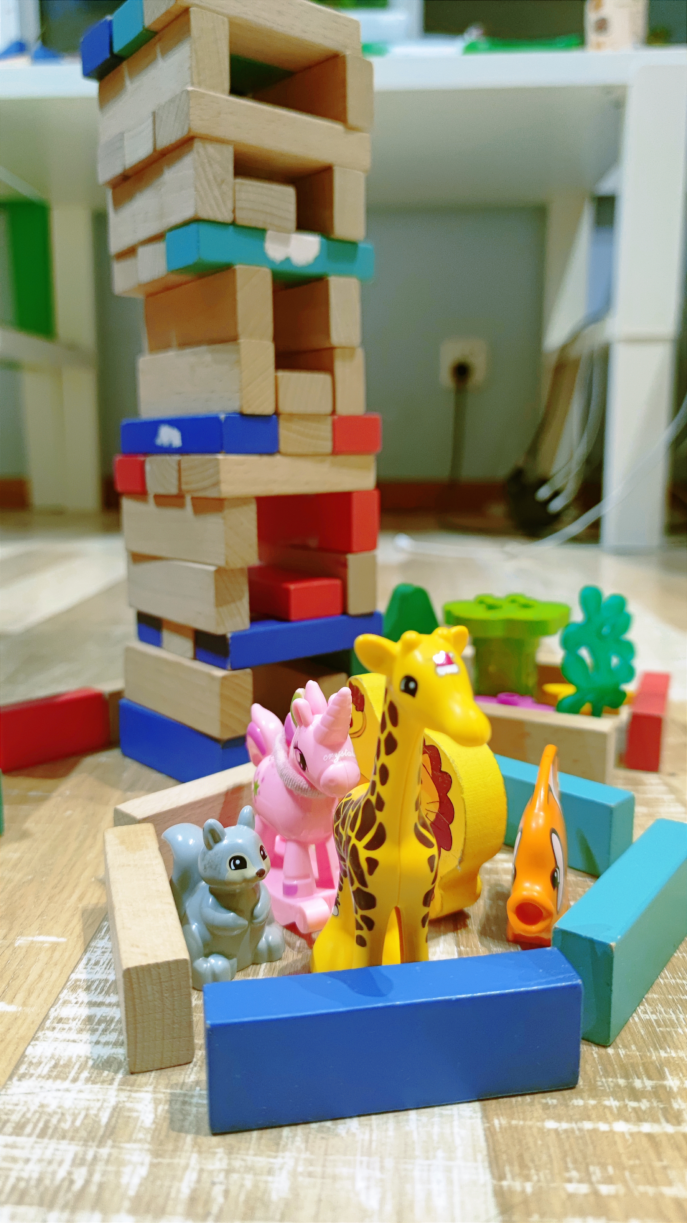 今天家里的小朋友又玩了会积木搭建的游戏,先搭了个坚固地不会被风吹倒的5层楼,然后拿出存放动物玩偶的储藏盒,选了长颈鹿、松鼠、鱼、狮子、独角兽来当自己的宠物,还在后面建了一个花园。
