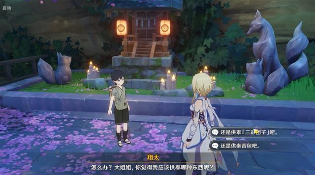 接到委托任务“神明啊,回应我吧”后,翔太会让我们选择供奉神龛的物品,这里需要选择“三彩团子”,并且,完成任务后,第二天要来到神龛这里调查。(很多玩家没有触发后续任务,就是因为没有来这里调查。)