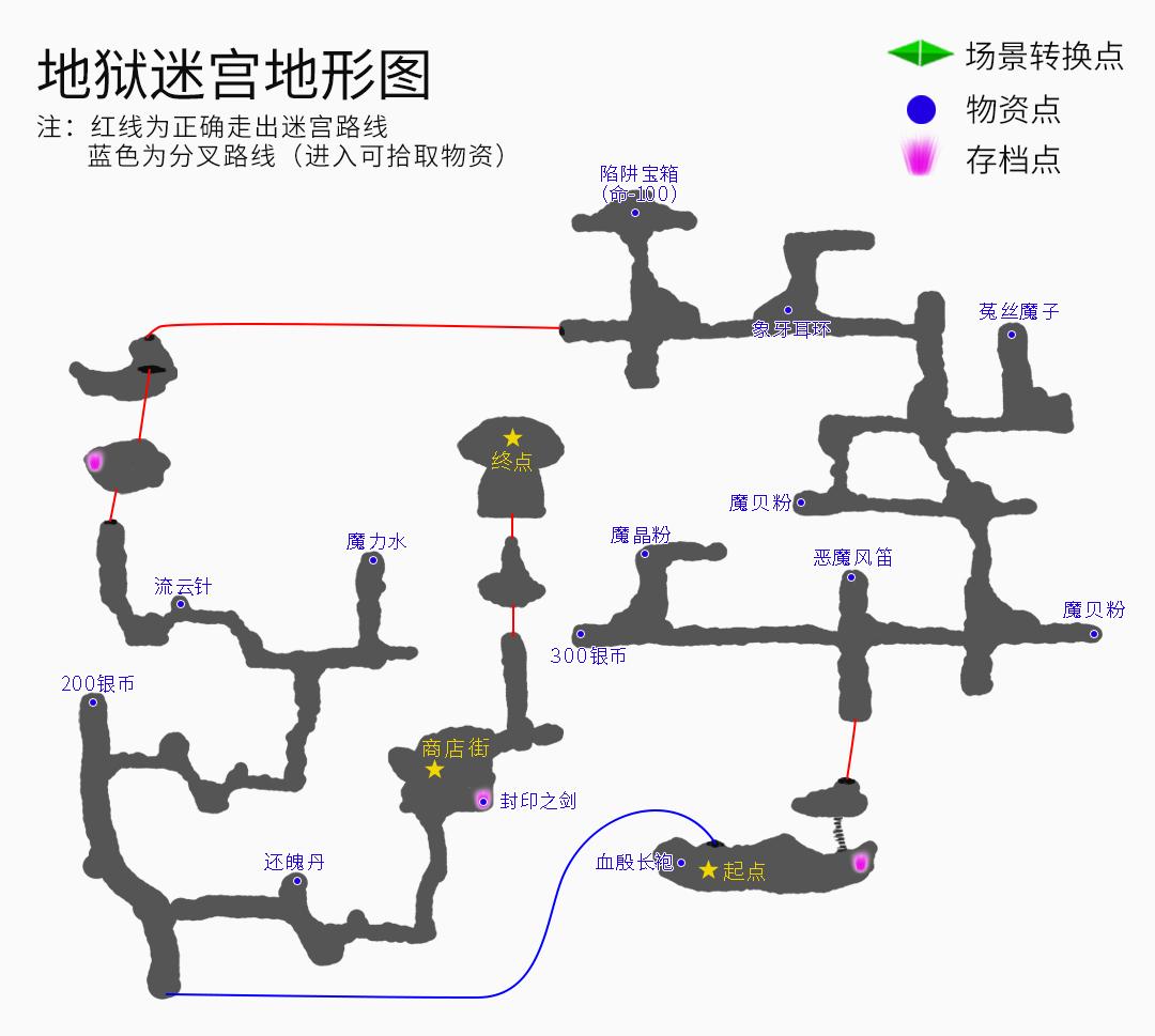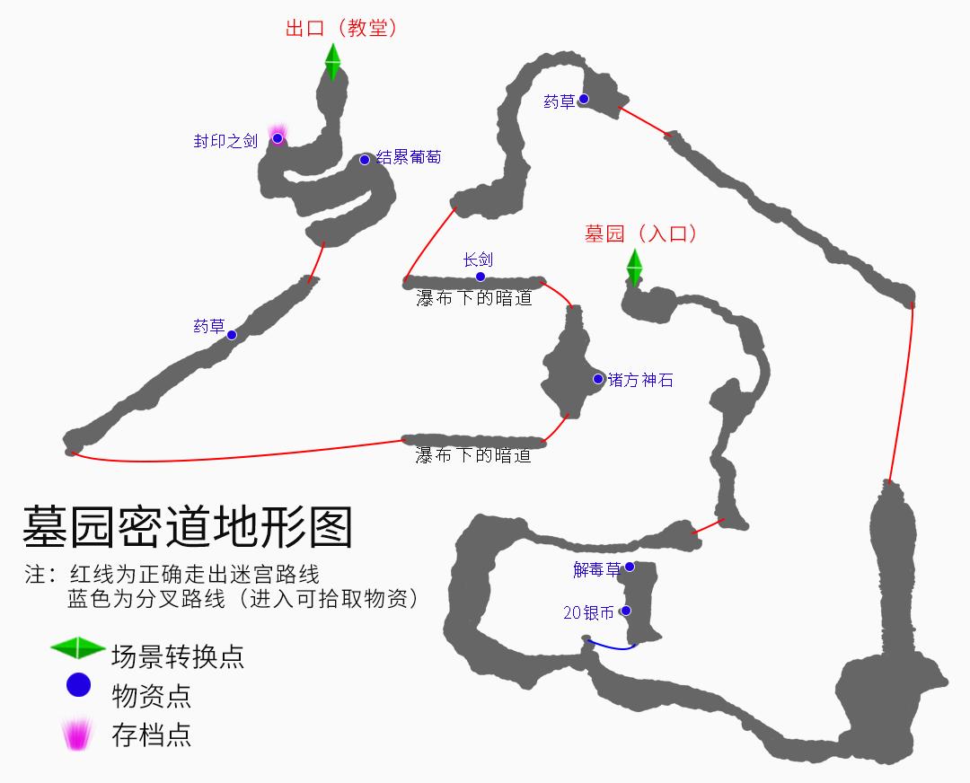 墓园密道(本场景路线很简单,就一条单一性的道路,一直往前走就可以)流程:出口位置拔下“封印之剑”→打倒守门怪物进入教堂后院(封印之剑基础攻击是20,外加每回合自动回复1%的命、体、灵,当熟练度满了之后,攻击可增加不少,不过很难升满。另外封印之剑是后期蚩尤出现的必备物品,必须集齐17把,所以在游戏中尽量不要错过或者用掉)。