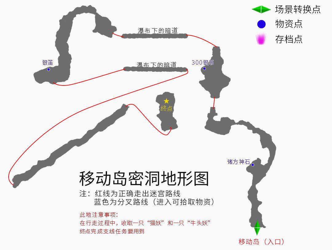 移动岛密洞(需在石像轰击冰岛之前进入,后面无法再进)城堡外东北方向有一处密洞,进入可收集到一些物品,同时在终点可用“妖猫”和“牛头鱼”换取“阿高斯”(两种怪在洞中抓取即可),完成后返回到城堡内。