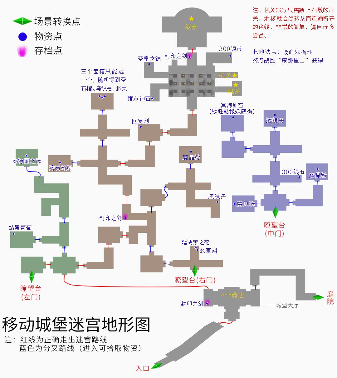 移动岛城堡流程:城堡外与护民官对话→进入城堡→在城堡终点战胜康那里士→返回外面与护民官对话→调查岛屿四周(注:①城堡大厅可购买各类物品;②触发与“格来艾”的战斗时,可用诸方神石换回复药,换不换随自己;③迷宫左上方三选一的宝箱,内中物品都是一样的,随机获得乌纹弓、圣石榴或是触发战斗;④迷宫机关处踩上石墩的开关就可以旋转木桥,从而连接断开的路线,每个位置都可以到达,多试几次即可)