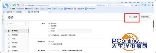 2、进入浏览器选项-基本设置页面,在该页面,找到【Internet选项】,点击该菜单按钮;
