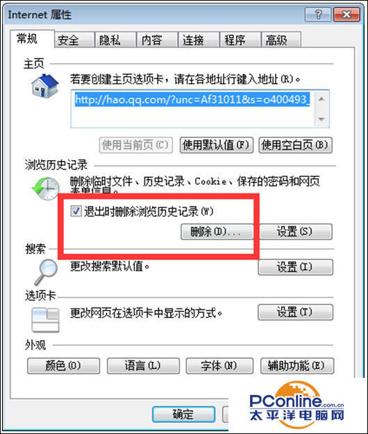 3、在弹出的【internet属性】页面的【常规】页,找到【删除】按钮,点击该按钮;