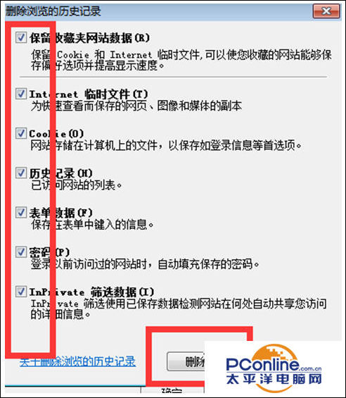 4、在弹出的【删除浏览的历史记录】页面,勾选要删除的信息,点击【删除】按钮,浏览记录则被删除。