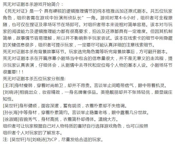 剧本杀:死无对证作者:答案发行:第五维度&浅渊工作室人数配置:3男2女游戏时长:5小时左右类型:现代/硬核/推理