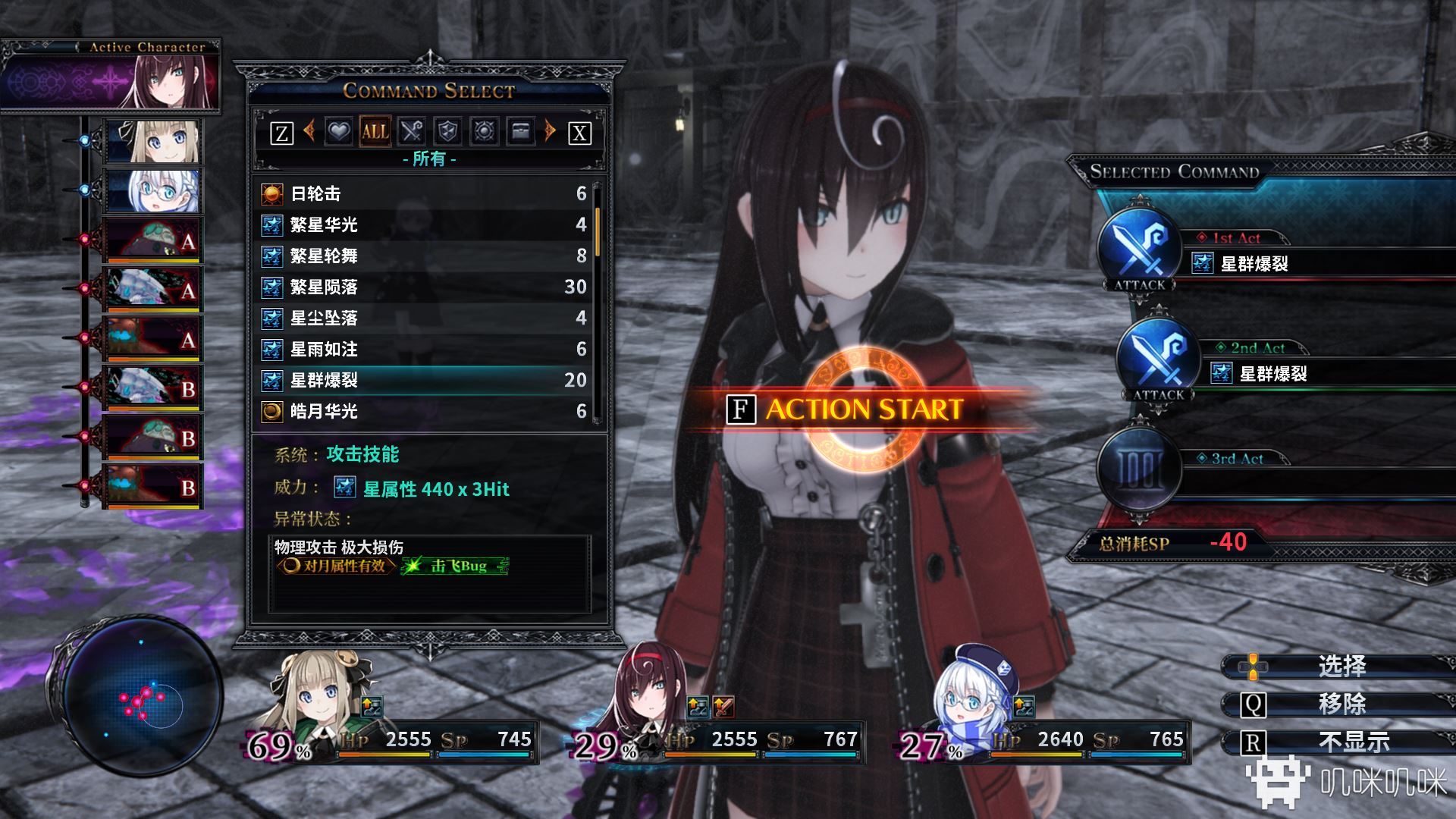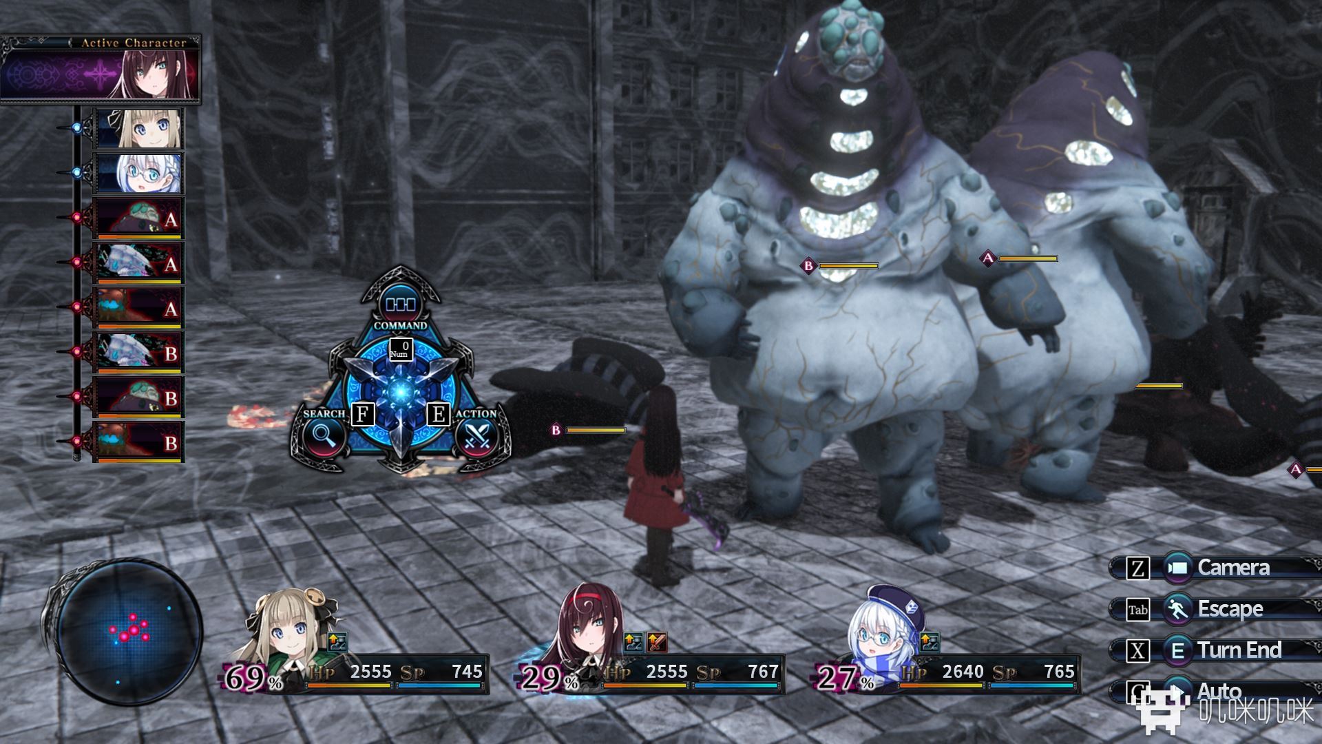 本作的玩法依然和前作保持一致,玩家角色和敌人根据速度属性轮流行动。玩家角色在行动时,如果选择连续进攻,那么便有可能将敌人击飞出去,让敌人互相碰撞或者撞到地图边界,制造更多的损伤。同时,如果敌人的运动轨迹上有其他友军,那么敌人飞到她们附近时还会受到追击,玩家可以利用这一系统把敌人当成三维弹球揍的满屏幕乱飞。游戏中的一些敌人由于有较高的闪避或者生命值,单纯的攻击技能很难对它们生效,但是如果合理规划击飞时的碰撞路径,就能事半功倍,打出上十倍的伤害乃至一键清屏。
