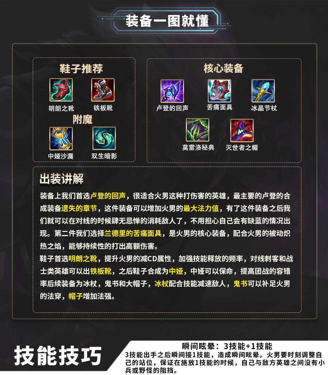 在团战后期我们的主要任务是打出出范围性伤害和眩晕关键目标,火男后期的伤害很可怕。尤其是被动和装备的效果叠加无论是打前排还是后排都能够拥有出色的效果。大招和被动的效果让火男即使是被人集火了都能提供成吨的伤害,为队友创造有利的输出环境。