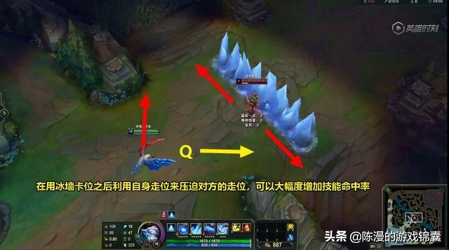 前面说过冰鸟的主要伤害都是利用Q技能触发E技能的双倍伤害特效来进行消耗或击杀,那么我们要思考的就是如何保证Q技能的命中率,这样后续的连招都水到渠成,最常用的战术就是在二技能的配合下利用人的下意识的逃避心理让他们自己去接到我们放的Q技能,在正常对线时一个突然的冰墙往往会让对手下意识的走位去跑到冰墙外面,而这个时候因为地形的改变对手只有上面和下面两条路可以选,而我们需要做的就是选择一个方向去走位而把Q技能向相反的方向施放 ,人在逃跑时都会下意识的远离自己的敌人,而这个时候因为我们的Q技能是往我们走位的相反方向施放的,对方的下意识行为就让他自己走到了我们的Q技能上,我们就可以晕住他之后打一套连招逼闪或击杀。
