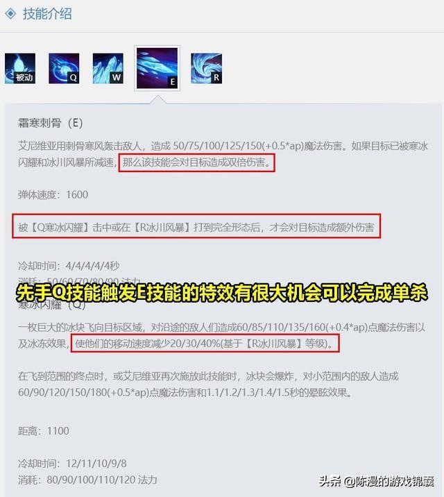 其实单独看冰鸟的技能描述,是完全看不出这个英雄的伤害是有多爆炸的:一技能是一个飞行速度非常缓慢的非指向技能,三技能虽然是指向性技能但是面板的基础伤害非常的低并且法伤加成也不算很高,二技能还是一个完全没有伤害的改变地形型技能,完全看不出伤害哪里爆炸,其实关键就在于冰鸟的三技能是有一个被动技能的:当目标被一技能和完全形态大招减速时,三技能可以造成双倍伤害,换句话说,当冰鸟的一技能晕住对面时,三技能的伤害就从150+0.5AP加成变成了300+1.0AP加成,在游戏中后期这个技能可以轻松打出上千的伤害。而这个技能的冷却时间仅仅4秒钟,再配合上一些CD装后,一套连招打出2—3个三技能,可以说是能轻松决定一场团战的胜负了。