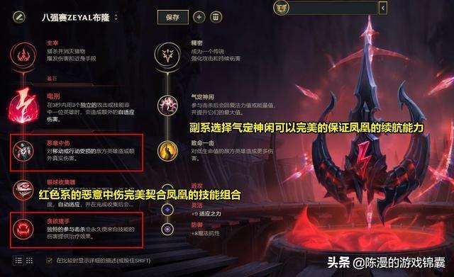 冰鸟的天赋选择其实有两种,分别是以主宰系电刑和巫术系彗星为主系的,阿漫经过上千场凤凰的锻炼,最终确定主系主宰副系精密是最适合凤凰的天赋搭配。熟练的凤凰是可以一秒打出电刑效果的,而且主宰系里的恶意中伤完美契合凤凰的技能机制,贪欲猎手极大地增强了凤凰的续航能力,而副系精密系选择气定神闲更是可以让凤凰可以做到打完一场团战依旧有很多法力值,可以说是完美的续航天赋,致命一击让凤凰的斩杀线极大地提高,在线上配合恶意中伤的效果可以轻松拿下单杀。