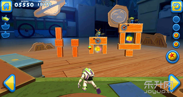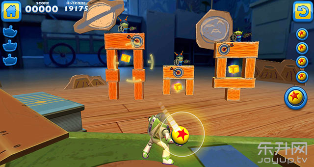 游戏的操作有点类似《愤怒的小鸟》——采用物理抛射方式,玩家将控制巴斯光年,利用反向拖动进行瞄准,将准星调整到想要的位置后松开即可。但是本作的自由度显然更胜一筹,这不仅表现在巴斯光年可以左右移动,更是由于游戏采用了3D画面,使场景更加立体,由此带来的视觉角度转换更为广阔,从而可以摸索出多种通关线路。
