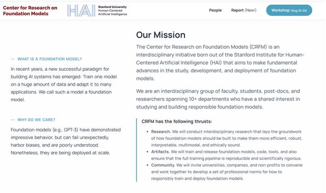 据斯坦福大学介绍,作为一个不同领域研究者共同存在的机构,CRFM的研究将不仅仅局限于传统的科学研究,HAI的联席主任John Etchemendy表示“这个新的机构的任务是贯彻‘以人为本’的理念,通过交叉领域的学术研究以促进基础模型在广泛的人类关心的议题上产生影响”。(This new center embodies the spirit of HAI by fostering interdisciplinary scholarship on foundation models with a focus on the range of human-centered issues that these models entail.)