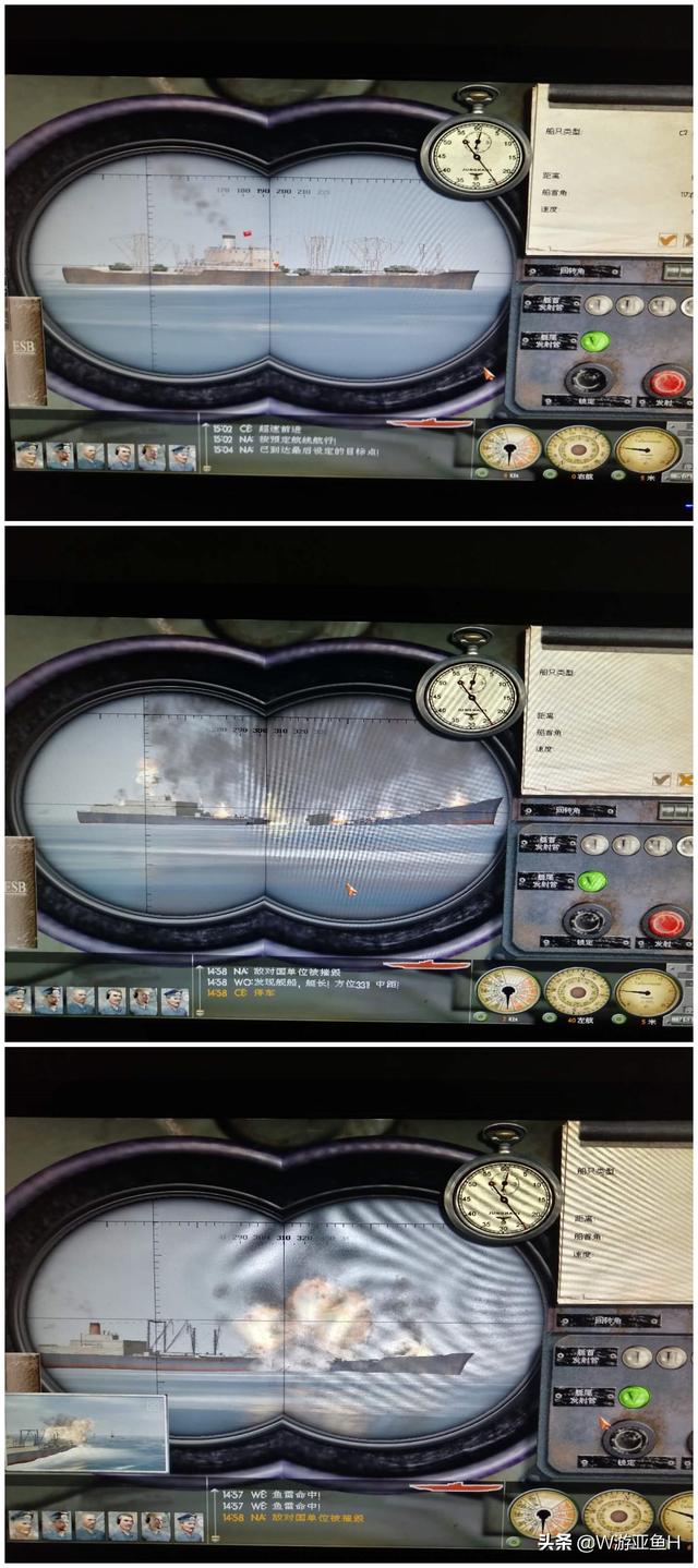 言归正传,猎杀潜航第一部门作品由美国Aeon电子娱乐公司与SSI小组联合开发的模拟类游戏,由第三波发行中文版。其实第一部作品就做的比较贴近真实的海战和潜艇内部了,在U型潜艇舰桥上观望有没有目标,还有声呐寻找。万一在白天有敌人飞机或者驱逐舰立即下潜。到了有驱逐舰以及飞机经常巡逻的海域,那必须那是日潜夜升。当发现了目标到追踪目标,用鱼雷击沉目标那是很高兴的啊。但是一代开始就有真实潜艇选项,记得里面有潜艇甲板炮开炮速度和弹药以及命中率选项,居然可以选无限弹药等,开了这些跟开了修改器没什么两样,在舰桥上开个时间压缩就可以看见自己潜艇甲板炮打谁谁挂,甚至于可以远距离PK战列舰,战列舰都不是潜艇的对手了,飞机来了也是一打一个准,这个就失去游戏的娱乐性了,至此到了二代以后都取消了!猎杀潜航2代开始就正式由大名鼎鼎的育碧制作发行了啊,2代给我就是1代在游戏画面,游戏性上面的升级,地图变得更大,增加了不少港口吧!基本上二代没有什么特别值得很不错的。唯一值得说的就是育碧这一年除了出猎杀潜航2代还出了驱逐舰指挥官,可以和猎杀潜航2代联网哟。
