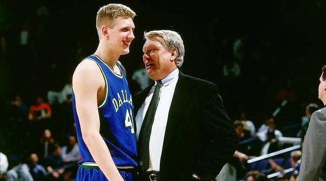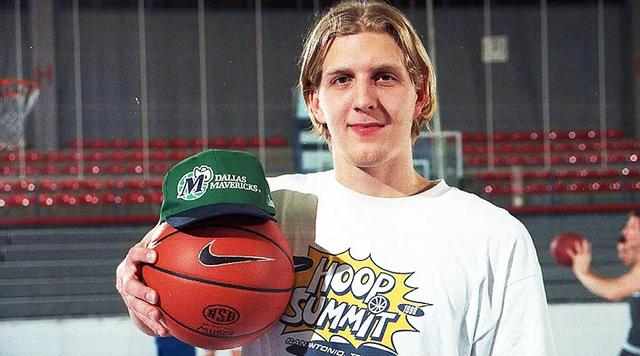 来自德国的金发蓝眼睛七尺神投手,下一个拉里·伯德,那只是奥尔巴赫戏谑的段子。拥有第十顺位的凯尔特人差一点拿下了德克,而老尼尔森和小尼尔森父子,早就前往德国去说服德克的父亲,让他同意德克来NBA打球。老尼尔森说,你可以放心把这孩子交给我,在美国,我就是他的父亲。