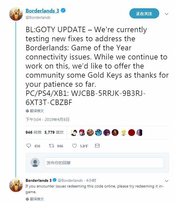 “我们正在尝试修复《无主之地:年度版》连接问题的新补丁,同时为了表达我们对玩家们耐心等待的谢意,在此奉上可以免费兑换游戏内金钥匙的代码:WJCBB-5RRJK-9B3RJ-6XT3T-CBZBF”。