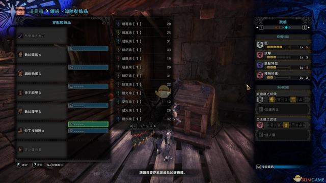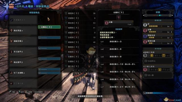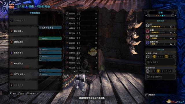 8、然后,再打上你缺少技能的珠子,则配装完成,没有珠子,只能牺牲一些技能,如果非要,则看第7点,与盛装手和帝王手a的替换类似,有所牺牲。下图是匠三和匠五丝瓜刀的配装,推荐体三。