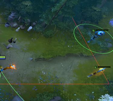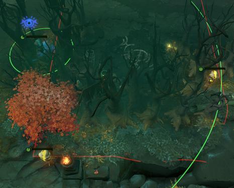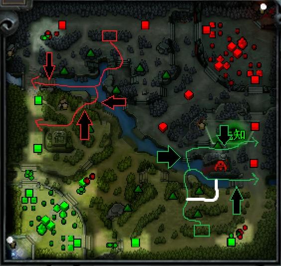 出兵15秒之后把靠兵线的树吃掉接着把兵按照红绿路线分别引到目标地,至于是引到一塔外还是两塔间得看具体情况,一般情况下我喜欢引到一塔外。原因在于很多鱼塘局的CARRY在遇到对方三号位勾兵的时候,通常都是一脸懵逼不知道发生了什么事以至于我们这边第一波兵他会直接放到塔下补塔刀。这样导致的结果就是当我们还在补第一波勾走的兵的时候,对面的第二波兵就已经直接冲到了我们面前,这样如果你勾到两塔间的话就会让第二波兵直接进塔进而增加补刀的难度。不过一些比较有经验的CARRY会带着兵线兜两圈停在己方塔外或者直接和我们一样勾到两塔间控兵线