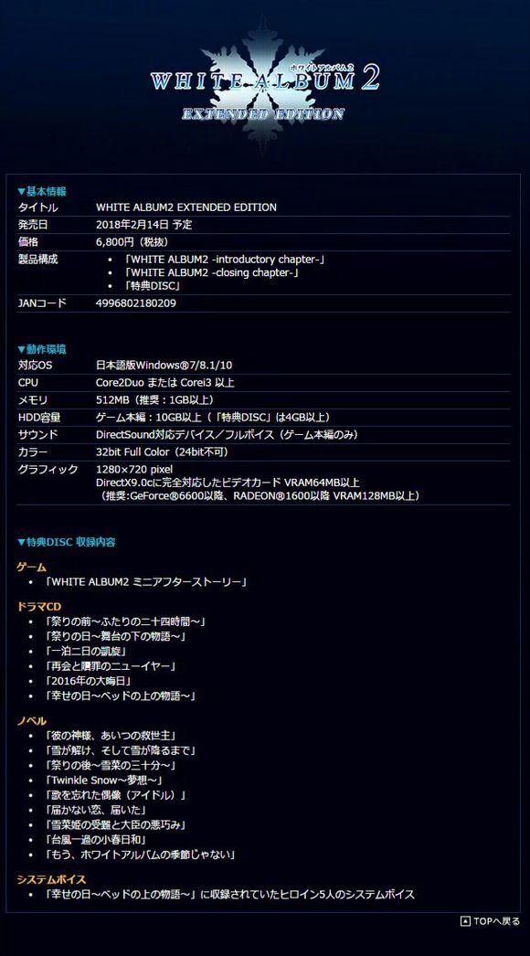 又到了白色相簿的季节...啊不对!是正处在白色相簿的季节!Leaf又双叒来圈钱啦!此前leaf官方就曾宣布,《白色相簿2》「WHITE ALBUM2 EXTENDED EDITION」将于 2018 年2月14日发售,售价6800日元(不含税)。本版本为补完短篇和本篇游戏整合的版本,今天官方公开了「白色相簿2 EXTENDED EDITION」的PV。