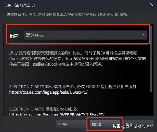 -于Steam客户端点击「开始游戏」后,弹出「安装」界面,选择「语言」后同意条款进行下一步;