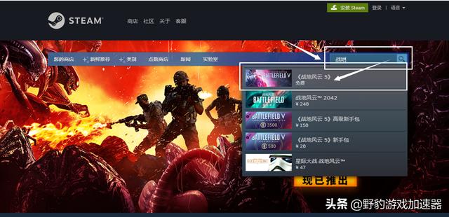 -使用野豹JSQ加速Steam后,前往Steam官网或打开Steam客户端,于商店右上角搜索框搜索《战地5》,点击对应选项进入《战地5》Steam商店页面;