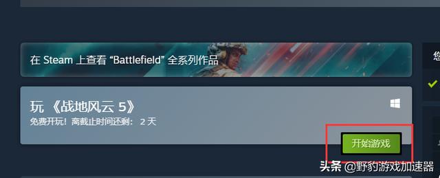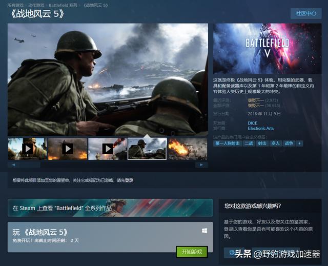 第一人称射击游戏《战地5》于Steam开启免费试玩,两天后结束,现可通过野豹JSQ一键加速Steam商店页面后快速下载,下载完成后可继续使用野豹免费加速《战地5》,畅享游戏+加速双免费!