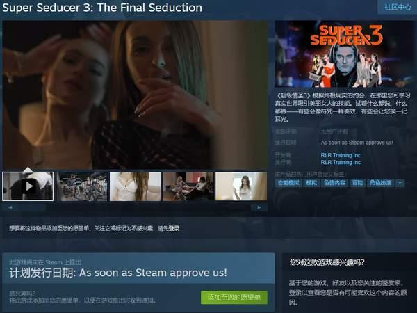 由RLR Training Inc制作发行的恋爱模拟《超级情圣3(Super Seducer 3)》原计划在2月16日登陆Steam发售,然而却被迫跳票了。制作组随后解释了原因,尺度过于Sexy被Steam审核打回了。目前游戏Steam页面发行时间一栏被官方标注为“As soon as Steam approve us!(一旦Steam批准我们)”。