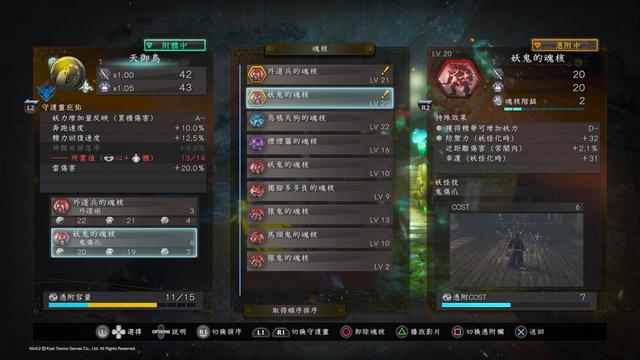 妖化:仁王2的主角和一代的纯人类不同,作为半妖半人的它不仅可以变身妖化,还可以使用击杀妖怪后掉落的魂核。看起来是个小改动但配合其他动作可以打出不一样的节奏,高手可以用它打出眼花缭乱的连击,新手可以说是保命的技能,为什么我说难度有所降低,就是因为这个妖化系统