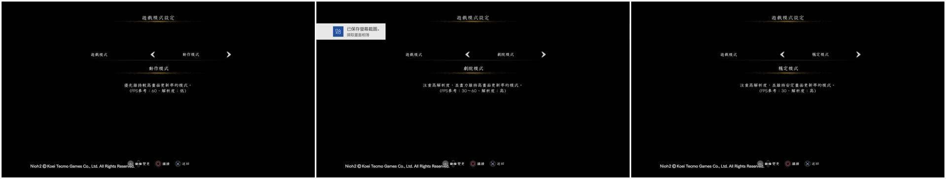 游戏模式支持动作模式(注重刷新率),稳定模式(注重画面)。剧院模式(平衡模式)。像我这样比较游戏流畅度的肯定选择动作模式。需要一提的是,仁王2对ps4的机能压榨的比较凶,我的PS4是PRO,运行游戏明显听到风扇的强力运转,游玩十多分钟后在PS4尾部用手试探热浪滚滚。