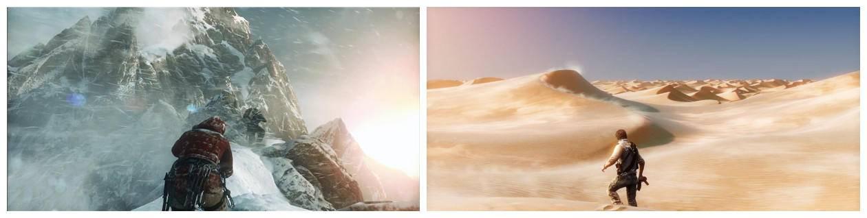 场景方面我个人特别喜欢古墓丽影,神秘海域这类游戏,主要就是场景设计的大气恢弘,玩起来有种旅游的感觉。古墓崛起开头的雪山,神秘海域3的沙海都是让我记忆犹新的游戏场景