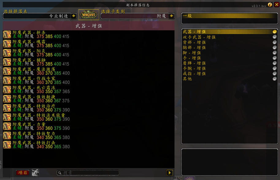 而且现在地下城中产出的拾取绑定图纸现在是非这类专业不能拾取,大家获取图纸的速度快了很多,毕竟附魔的种类多了,才会受到玩家们的青睐。有许多图纸是各阵营声望购买,有的在某个角落的NPC出售,这也导致许多玩家的附魔图纸不齐。