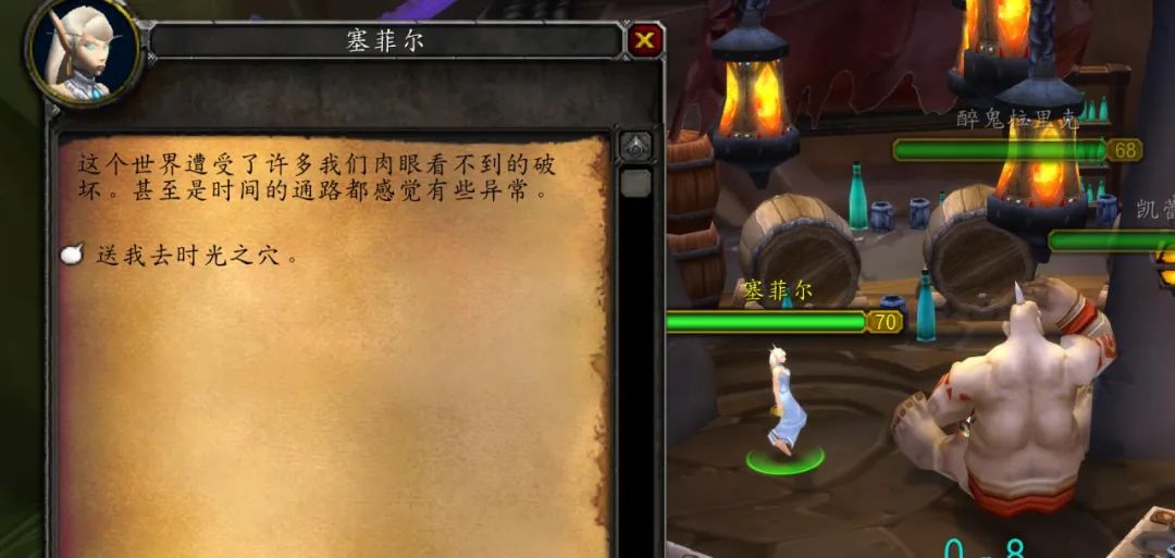 时光守护者声望达到崇敬的玩家可以与沙塔斯天涯旅店NPC赛菲尔对话,传送至时光之穴,以后去海山再也不用坐飞机了。