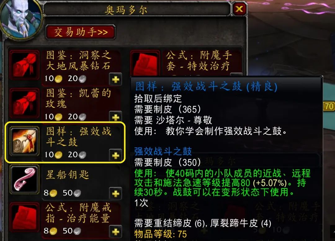 制皮强效战鼓图样已经开放,简单来说普通战鼓图样哪里出售或学习,对应的强效鼓图样就在哪里。使用强效战鼓需要365点制皮技能。
