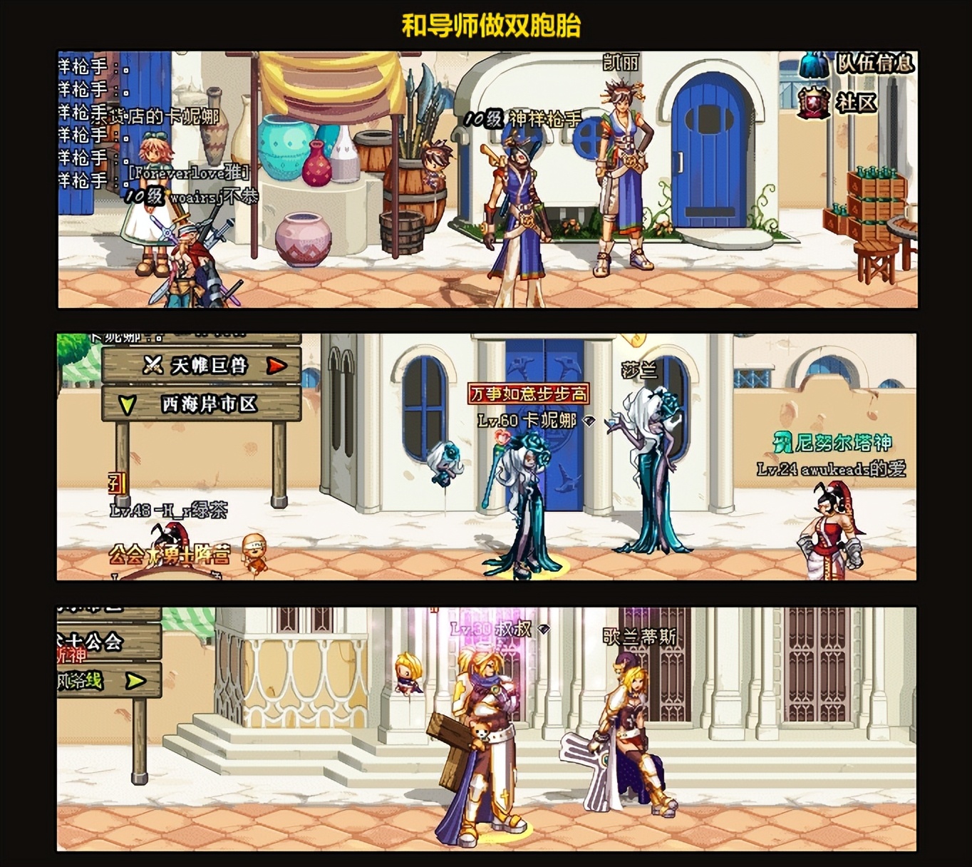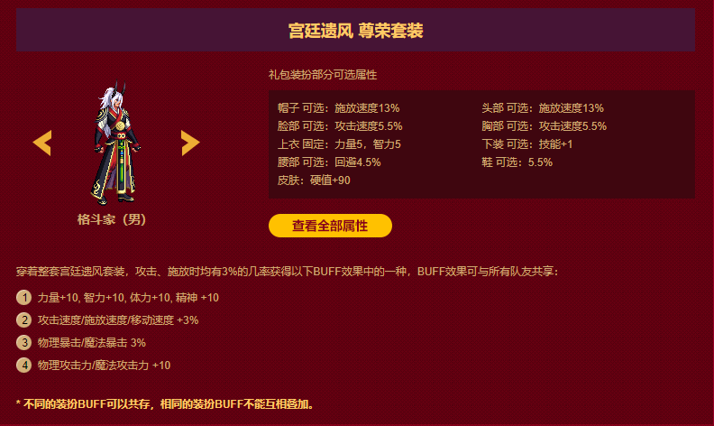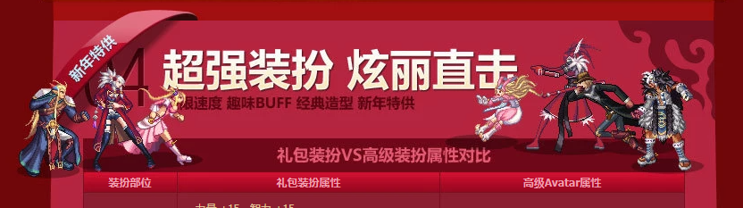 2011年贺岁礼包2011年的礼包算是争议比较大的,主要原因就是价格过高。这套装扮的设计思路同样是COS主线中的NPC:鬼剑士——奥尔卡,格斗家——赛丽亚,神枪手——沙影贝利特,魔法师——敏泰,圣职者——克伦特,女枪手——泽丁施耐德,暗夜使者——米内特。此外,这也是当时的新职业:女枪手、暗夜使者的第一套贺岁时装。