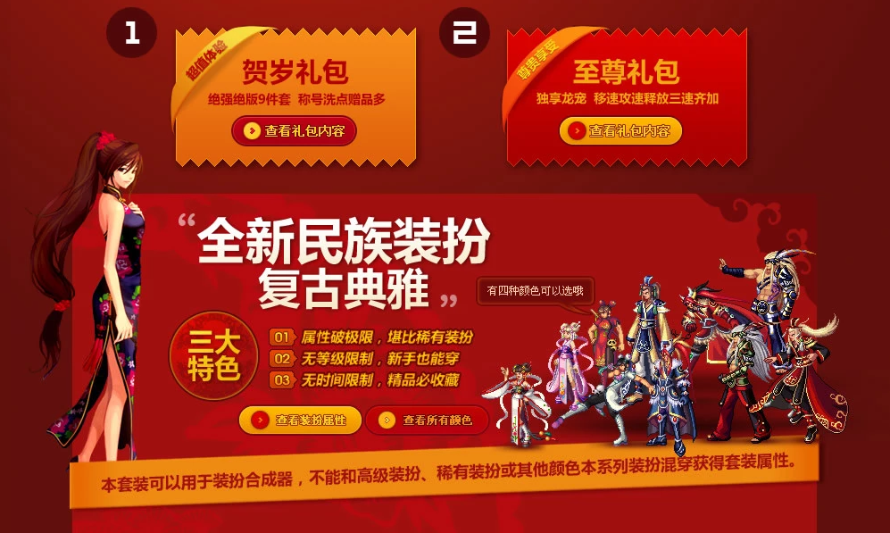2010年贺岁礼包这套装扮俗称“民族套”,也是国服第一套首发的礼包。从装扮上看就十分具有中国风,尤其是格斗家和魔法师的丸子头,非常可爱,这套装扮放在今天也会非常受欢迎。另外,礼包中的白虎称号也在当时风靡一时,价格被炒的相当惊人。