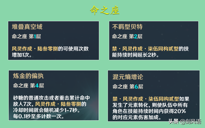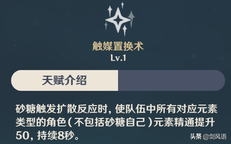 2.突破固有天赋,如下图,E技能和大招命中敌人,队伍其他角色获得基于砂糖20%的元素精通加成。理论上可以叠到1000点元素精通,即是提供队伍其他角色200点元素精通,加上扩散反应的50点元素精通,那一共提供队伍其他角色250点元素精通。由此得出,砂糖主要叠元素精通属性。
