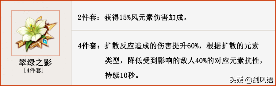翠绿之影4件套:增加风伤、提升扩散伤害,同时降低敌人抗性。风系聚怪毕业圣遗物。