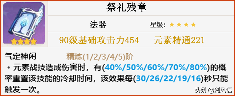 祭礼残章:目前最契合砂糖的武器,增加元素精通,同时还可以获得1次重置E技能。提升大招循环。可达到瞬间开大。性价比高。