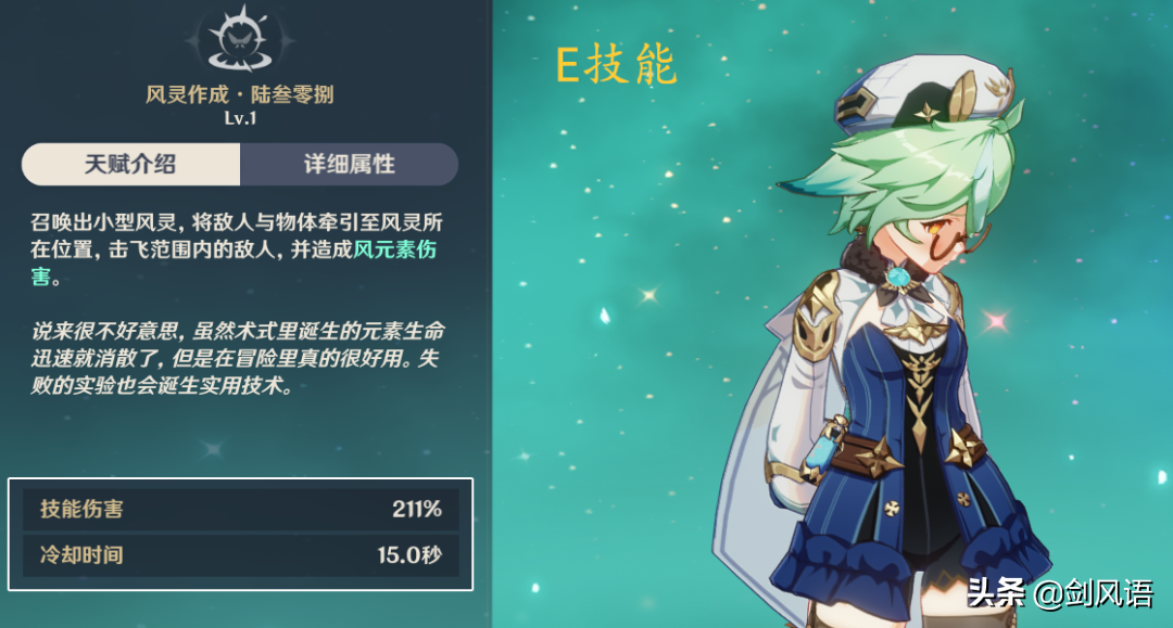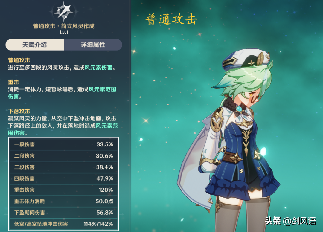 1.普通攻击伤害倍率并不高,但可以打出风伤,也就是可以打出扩散反应,突破固有天赋,触发扩散反应时,队伍其他角色获得50点元素精通。也就是普通攻击、E技能、大招。都可以给队伍其他角色提供50点元素精通。