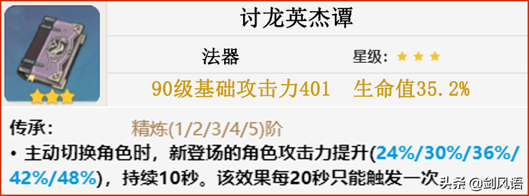 讨龙英杰谭:工具人的神器,提升主C48%攻击力,适合前期带,或者砂糖辅助魈时带。