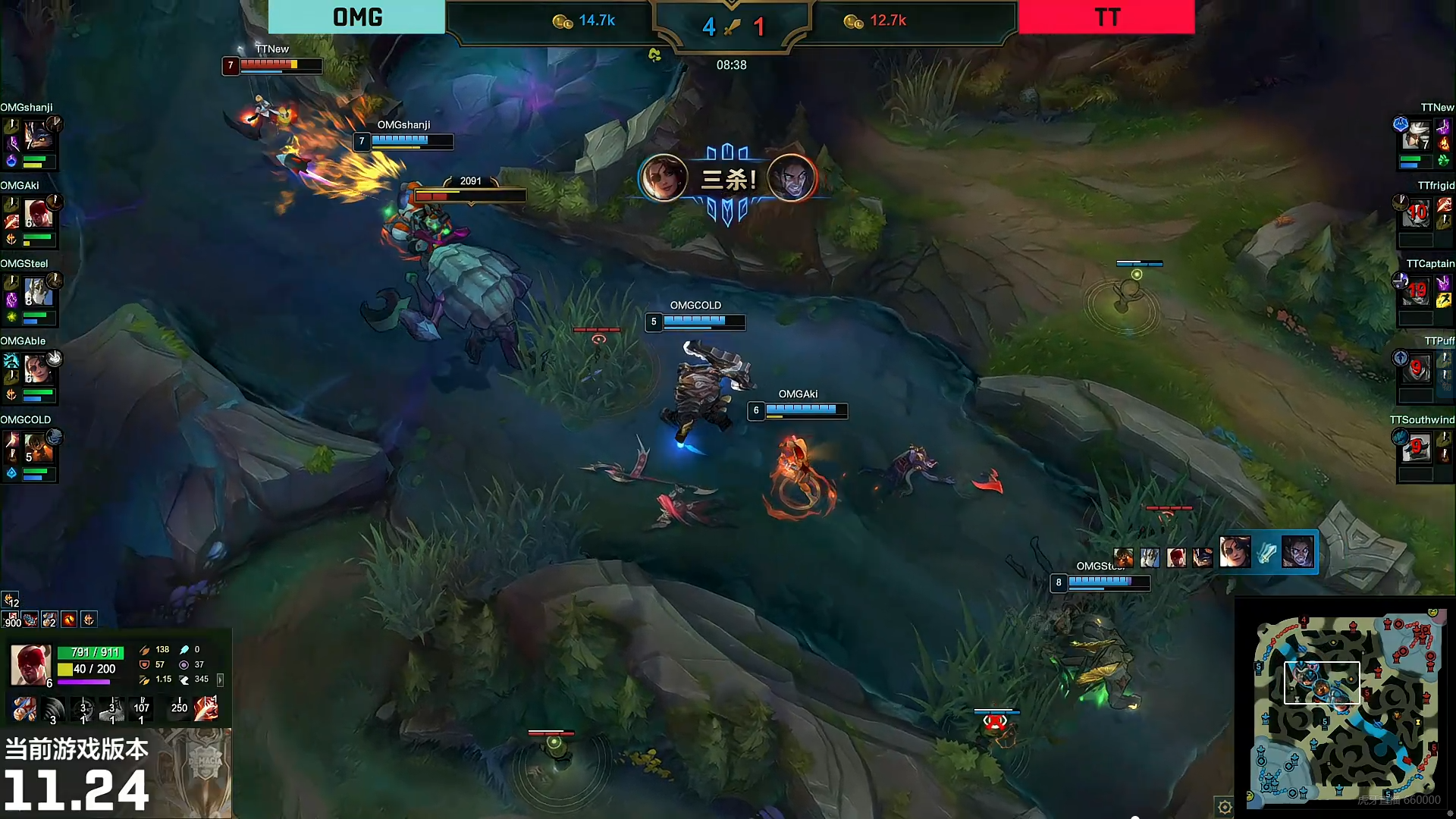 比赛18分钟双方在上路河道爆发团战,Able在这波团战中又打出了一波精彩的表现,刷出S级评分后化身刺客,果断闪现进场怒斩TT下路双人组,Able拿下双杀后优势进一步扩大。不得不说,Able的打法是真的非常自信,果断决绝。