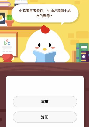 小鸡宝宝考考你,“山城”是哪个城市的雅号?这是蚂蚁庄园6月13号今日庄园小课堂的问题,很多用户还不知道答案,本文小编会为大家详细介绍,感兴趣的小伙伴们,一起和小编来看看吧!