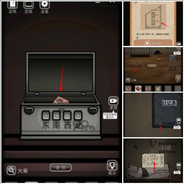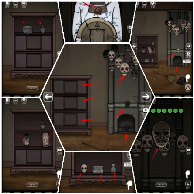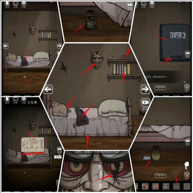 拿到保姆钥匙,打开一楼保姆的房间有一张床床上床下墙上都是线索,床底下有一个瓶子,玩过小游戏得到蛇,床上几次衣服得到车票,枕头底下得到日记本,墙上挂的面具可以得到蜈蚣
