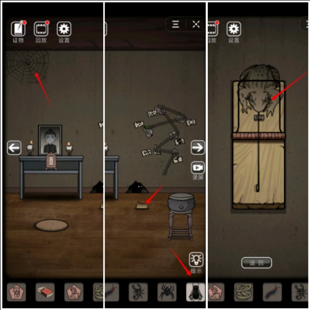回到排位视角左上角得到蜘蛛,过会蜘蛛网会粘住苍蝇,将苍蝇放在夹子上抓住蟾蜍,五毒凑齐